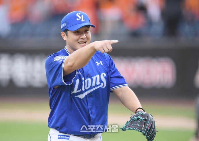삼성 선발투수 최원태가 19일 대전 한화생명볼파크에서 열린 2025 KBO 포스트시즌 플레이오프 2차전 한화와 경기 7회 투구 후 더그아웃으로 들어오며 환호하고 있다.