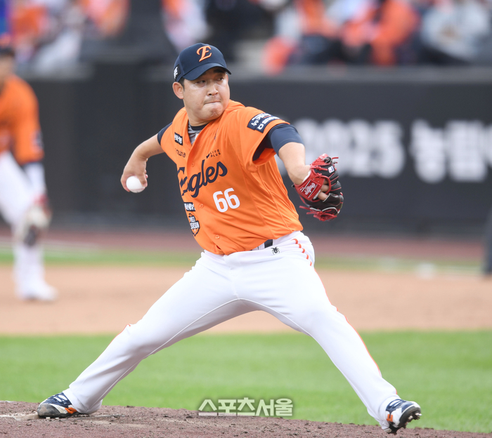 한화 투수 주현상이 19일 대전 한화생명볼파크에서 열린 2025 KBO 포스트시즌 플레이오프 2차전 삼성과 경기 7회 역투하고 있다.