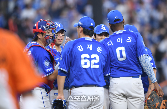 삼성 선수들이 19일 대전 한화생명볼파크에서 열린 2025 KBO 포스트시즌 플레이오프 2차전 한화와 경기 승리 후 하이파이브를 하며 승리를 자축하고 있다.