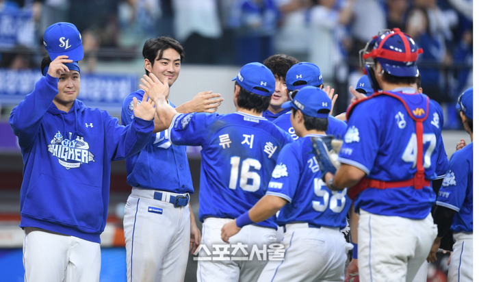 삼성 선발투수 최원태가 19일 대전 한화생명볼파크에서 열린 2025 KBO 포스트시즌 플레이오프 2차전 한화와 경기 승리 후 선수들과 하이파이브를 하고 있다.