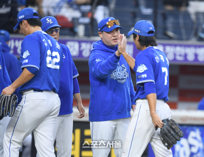 삼성 박진만 감독이 19일 대전 한화생명볼파크에서 열린 2025 KBO 포스트시즌 플레이오프 2차전 한화와 경기 승리 후 선수들과 하이파이브를 하고 있다.