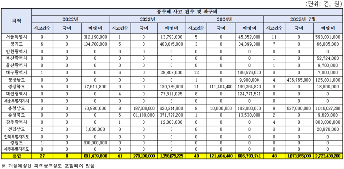 지자체별로 살펴보면, 지난 4년간(2022~2025.7) 파크골프장 풍수해 복구 비용은 충남이 약 23억 원으로 가장 많았으며, 이어 서울 약 9억 원, 광주 약 8억 원 순으로 많은 것으로 나타났다.