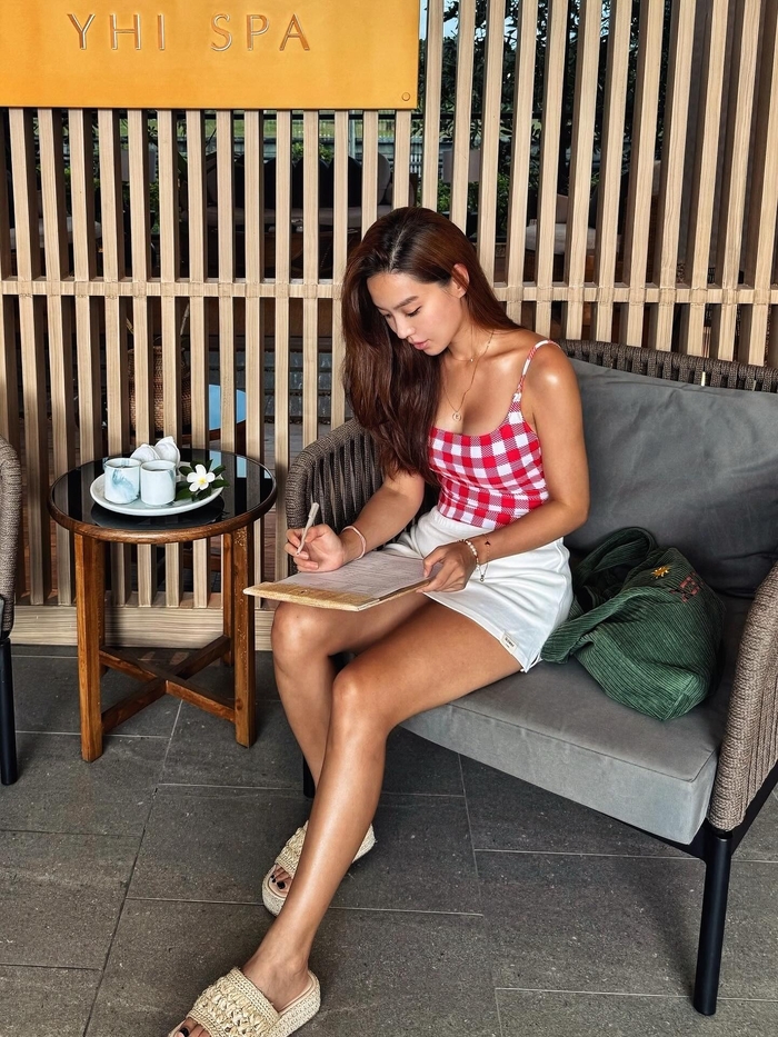 특히 체크 패턴 슬리브리스, 리넨 원피스, 로브 가운 등 자연스러운 리조트룩을 완벽하게 소화하며, 특유의 건강한 매력과 세련된 분위기를 자아냈다. 김희정의 탄탄한 피지컬과 햇살에 반짝이는 피부톤은 여름의 에너지를 담은 듯 해보인다.