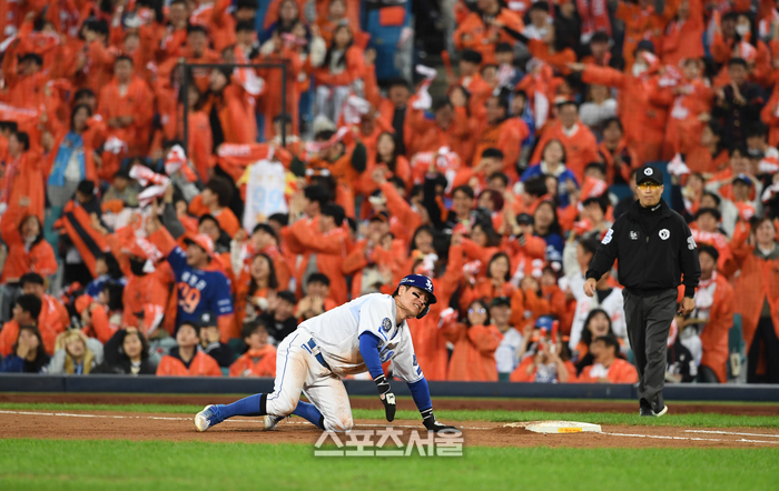 삼성 강민호가 21일 대구 삼성라이온즈파크에서 열린 2025 KBO리그 한화와의 플레이오프 3차전 3회말 무사 1루 류지혁의 우익수 뜬공에 1루에서 스타트를 했다가 귀루하지 못하고 아웃된 뒤 아쉬워하고 있다. 2025. 10. 21.