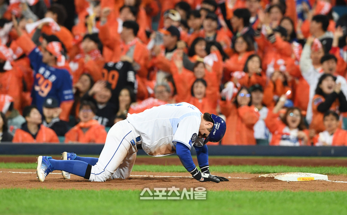삼성 강민호가 21일 대구 삼성라이온즈파크에서 열린 2025 KBO리그 한화와의 플레이오프 3차전 3회말 무사 1루 류지혁의 우익수 뜬공에 1루에서 스타트를 했다가 귀루하지 못하고 아웃된 뒤 아쉬워하고 있다. 2025. 10. 21.