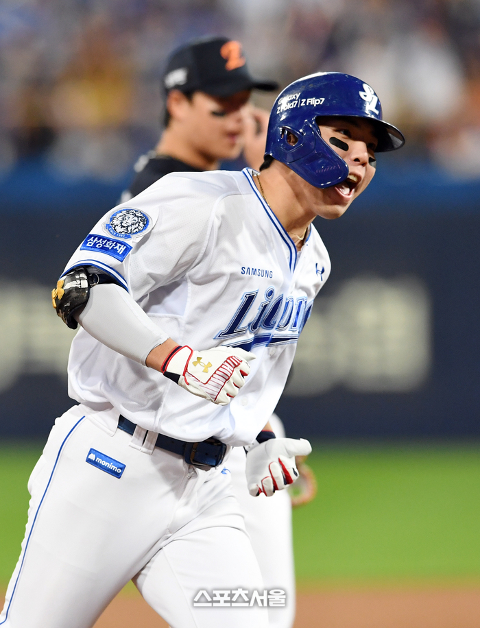 삼성 김영웅이 21일 대구 삼성라이온즈파크에서 열린 2025 KBO리그 한화와의 플레이오프 3차전 4회말 1사 1-2루 상황에서 한화 선발 류현진을 상대로 역전 3점 홈런을 치고 베이스를 돌고 있다. 2025. 10. 21.