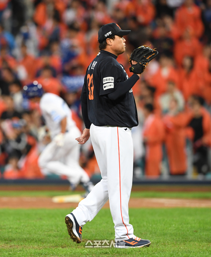 한화 류현진이 21일 대구 삼성라이온즈파크에서 열린 2025 KBO리그 삼성과의 플레이오프 3차전 4회말 1사 1-2루 상황에서 삼성 김영웅에게 3점 홈런을 허용한 뒤 아쉬워하고 있다. 2025. 10. 21.