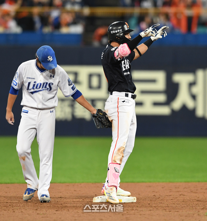 한화 리베라토가 21일 대구 삼성라이온즈파크에서 열린 2025 KBO리그 삼성과의 플레이오프 3차전 5회초 1사 2루 상황에서 삼성 후라도를 상대로 1타점 2루타를 친 뒤 세리머니를 하고 있다. 2025. 10. 21.