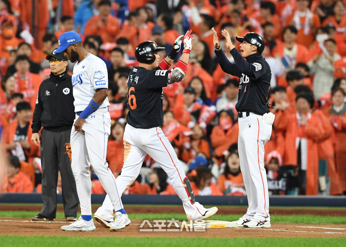 한화 하주석이 21일 대구 삼성라이온즈파크에서 열린 2025 KBO리그 삼성과의 플레이오프 3차전 8회초 1사 1루 상황에서 삼성 이호성을 상대로 안타를 친 뒤 추승우 코치와 하이파이브를 하고 있다. 2025. 10. 21.