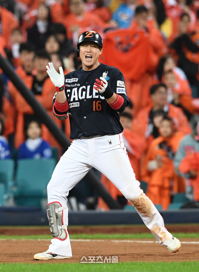 한화 하주석이 21일 대구 삼성라이온즈파크에서 열린 2025 KBO리그 삼성과의 플레이오프 3차전 8회초 1사 1루 상황에서 삼성 이호성을 상대로 안타를 친 뒤 기뻐하고 있다. 2025. 10. 21.