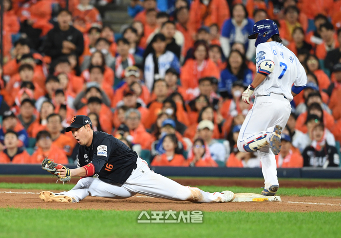 한화 1루수 하주석이 21일 대구 삼성라이온즈파크에서 열린 2025 KBO리그 삼성과의 플레이오프 3차전 8회말 무사 1루 삼성 이재현의 희생번트 때 송구를 힘겹게 잡아내고 있다. 2025. 10. 21.