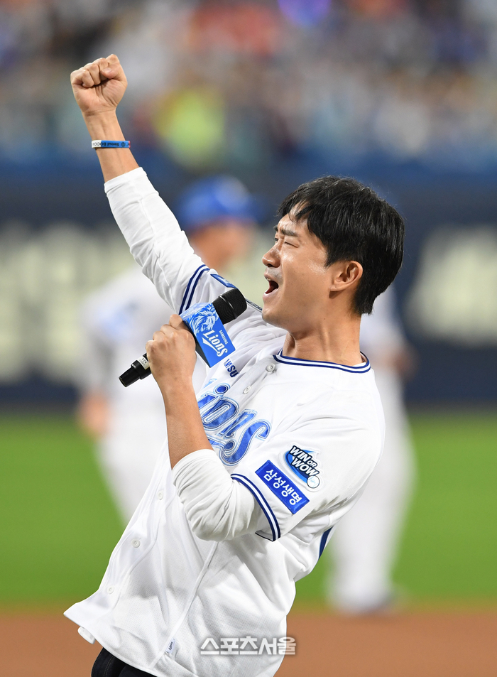 배우 조우진이 21일 대구 삼성라이온즈파크에서 열린 2025 KBO리그 한화와 삼성의 플레이오프 3차전에 앞서 시구에 나서면서 삼성 팬들의 응원을 유도하고 있다. 2025. 10. 21.