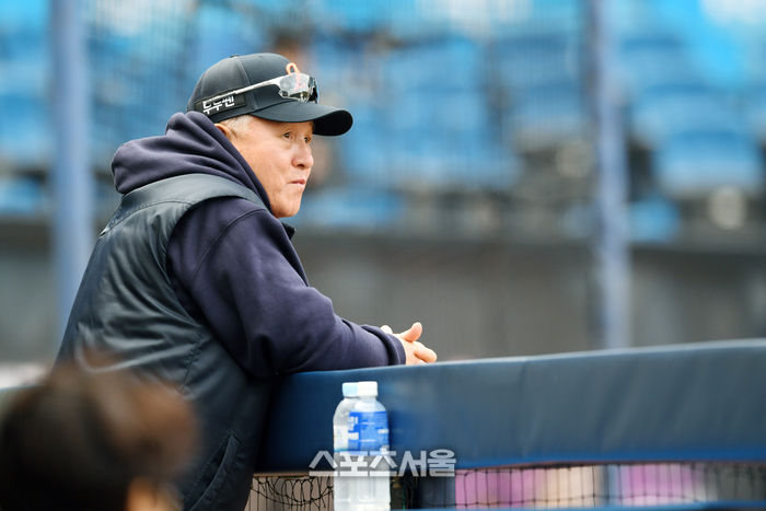 한화 김경문 감독이 22일 대구 삼성라이온즈파크에서 열리는 2025 KBO리그 삼성과의 플레이오프 4차전에 앞서 선수들의 훈련을 지켜보고 있다. 2025. 10. 22.