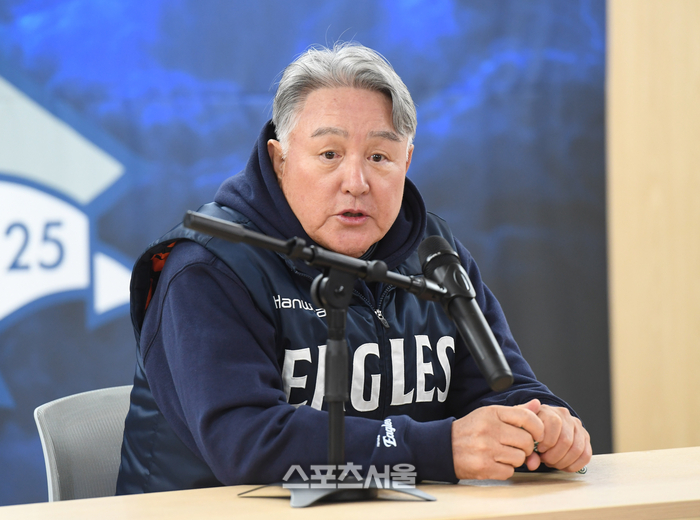 한화 김경문 감독이 22일 대구 삼성라이온즈파크에서 열리는 2025 KBO리그 삼성과의 플레이오프 4차전에 앞서 취재진과 인터뷰를 하고 있다. 2025. 10. 22.