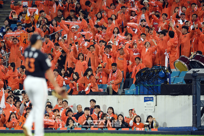 22일 대구 삼성라이온즈파크에서 열린 2025 KBO리그 한화와 삼성의 플레이오프 4차전에서 한화 팬들이 선발투수 정우주의 호투에 환호하고 있다. 2025. 10. 22.