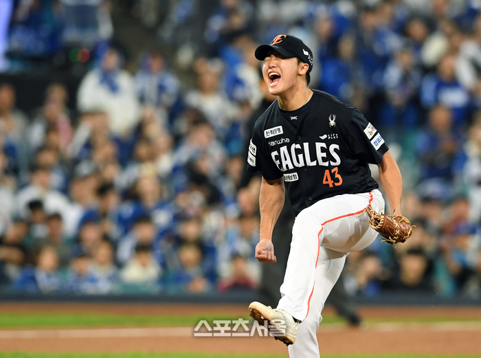 한화 선발투수 정우주가 22일 대구 삼성라이온즈파크에서 열린 2025 KBO리그 삼성과의 플레이오프 4차전 3회말 1사 1루 상황에서 삼성 김성윤을 병살타로 잡아내고 위기를 넘기면서 포효하고 있다. 2025. 10. 22.