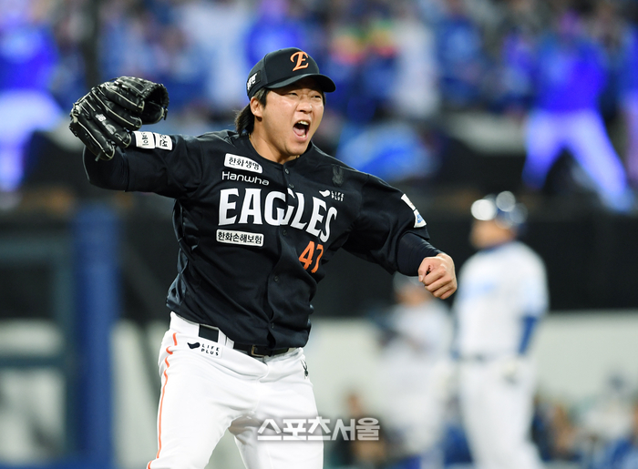 한화 투수 김범수가 22일 대구 삼성라이온즈파크에서 열린 2025 KBO리그 삼성과의 플레이오프 4차전 4회말 2사 2루 상황에서 삼성 박병호를 삼진으로 잡아낸 뒤 포효하고 있다. 2025. 10. 22.