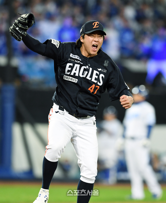 한화 투수 김범수가 22일 대구 삼성라이온즈파크에서 열린 2025 KBO리그 삼성과의 플레이오프 4차전 4회말 2사 2루 상황에서 삼성 박병호를 삼진으로 잡아낸 뒤 포효하고 있다. 2025. 10. 22.