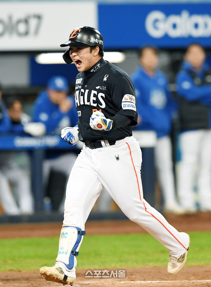 한화 문현빈이 22일 대구 삼성라이온즈파크에서 열린 2025 KBO리그 삼성과의 플레이오프 4차전 5회초 2사 2-3루 상황에서 삼성 원태인을 상대로 3점 홈런을 친 뒤 포효하고 있다. 2025. 10. 22.