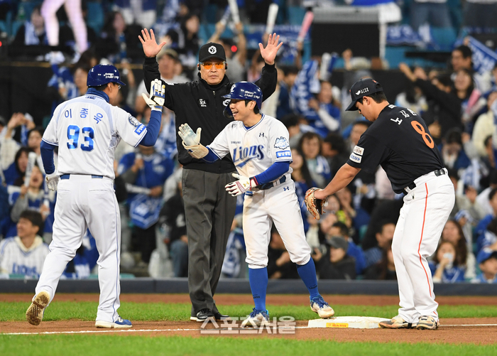 삼성 김지찬이 22일 대구 삼성라이온즈파크에서 열린 2025 KBO리그 한화와의 플레이오프 4차전 6회말 무사 한화 황준서를 상대로 3루타를 친 뒤 이종욱 코치와 하이파이브를 하고 있다. 2025. 10. 22.