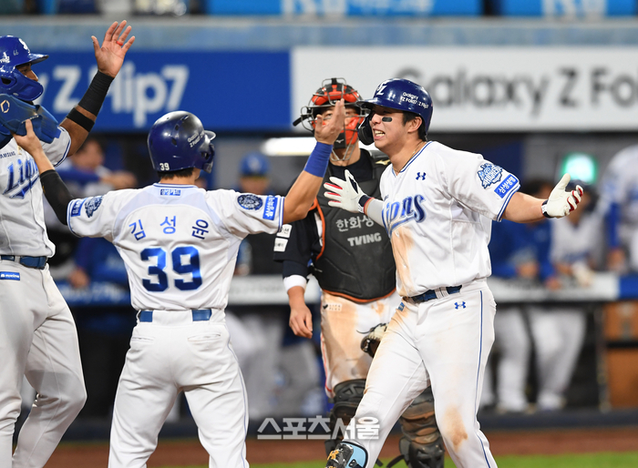 삼성 김영웅(오른쪽)이 22일 대구 삼성라이온즈파크에서 열린 2025 KBO리그 한화와의 플레이오프 4차전 6회말 1사 1-3루 상황에서 한화 김서현을 상대로 동점 3점 홈런을 친 뒤 선행주자 디아즈-김성윤과 하이파이브를 하고 있다. 2025. 10. 22.