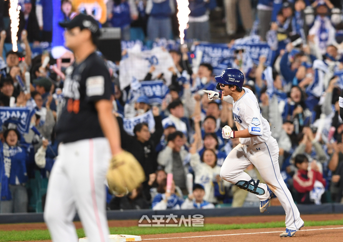 삼성 김영웅이 22일 대구 삼성라이온즈파크에서 열린 2025 KBO리그 한화와의 플레이오프 4차전 6회말 1사 1-3루 상황에서 한화 김서현을 상대로 동점 3점 홈런을 친 뒤 베이스를 돌고 있다. 2025. 10. 22.