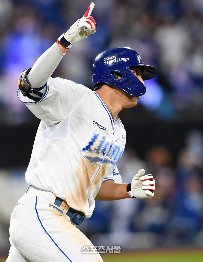 삼성 김영웅이 22일 대구 삼성라이온즈파크에서 열린 2025 KBO리그 한화와의 플레이오프 4차전 6회말 1사 1-3루 상황에서 한화 김서현을 상대로 동점 3점 홈런을 치고 기뻐하고 있다. 2025. 10. 22.