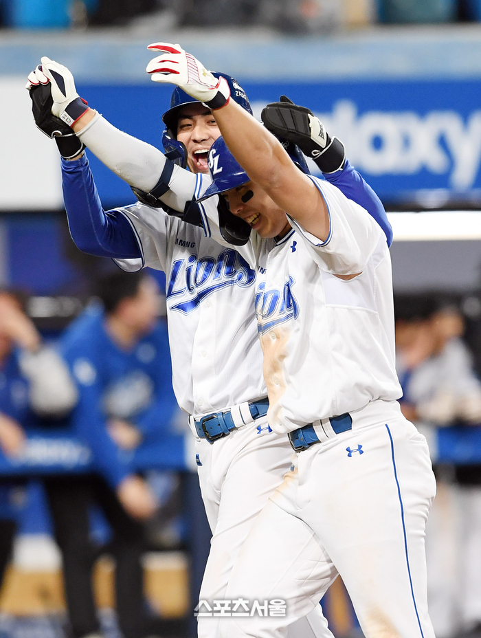 삼성 김영웅(오른쪽)이 22일 대구 삼성라이온즈파크에서 열린 2025 KBO리그 한화와의 플레이오프 4차전 7회말 1사 1-2루 상황에서 한화 한승혁을 상대로 동점 3점 홈런을 치고 선행주자 구자욱과 하이파이브를 하며 기뻐하고 있다. 6회에 이은 김영웅의 연타석 3점 홈런. 2025. 10. 22.
