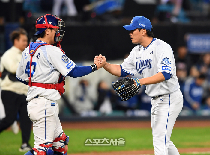 삼성 김재윤(오른쪽)이 22일 대구 삼성라이온즈파크에서 열린 2025 KBO리그 한화와의 플레이오프 4차전 9회초 등판해 승리를 지켜낸 뒤 포수 강민호와 하이파이브를 나누고 있다. 2025. 10. 22.