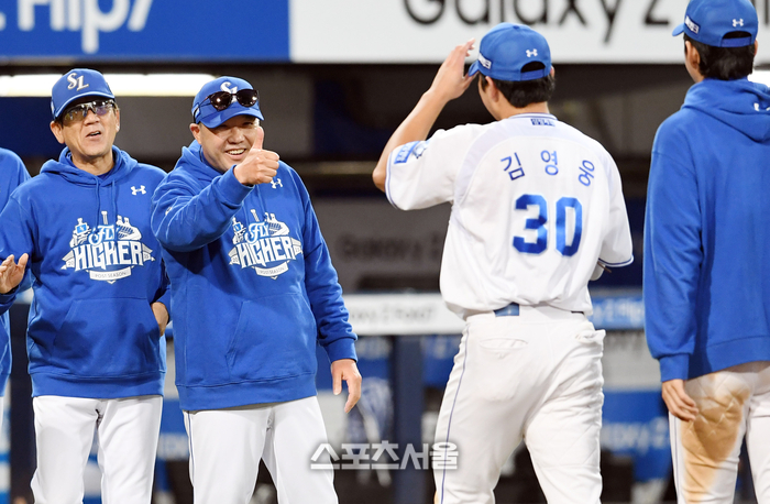 삼성 박진만 감독(왼쪽 둘째)이 22일 대구 삼성라이온즈파크에서 열린 2025 KBO리그 한화와의 플레이오프 4차전에서 7-4로 승리한 뒤 3점 홈런 2개로 맹활약한 김영웅을 향해 엄지를 치켜고 있다. 한화에 승리한 삼성은 시리즈 전적 2승 2패를 기록하며 대전 원정 5차전을 떠나게 됐다. 2025. 10. 22.