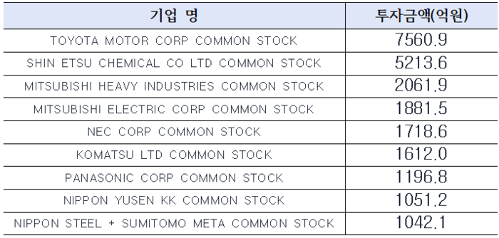 2025년 2월 기준 국민연금이 1000억원 이상 투자한 강제동원 기업은 9개로 토요타 자동차 7560.9억, 신에츠 화학 5213.6억, 미쓰비시 중공업 2061.9억원이다.
