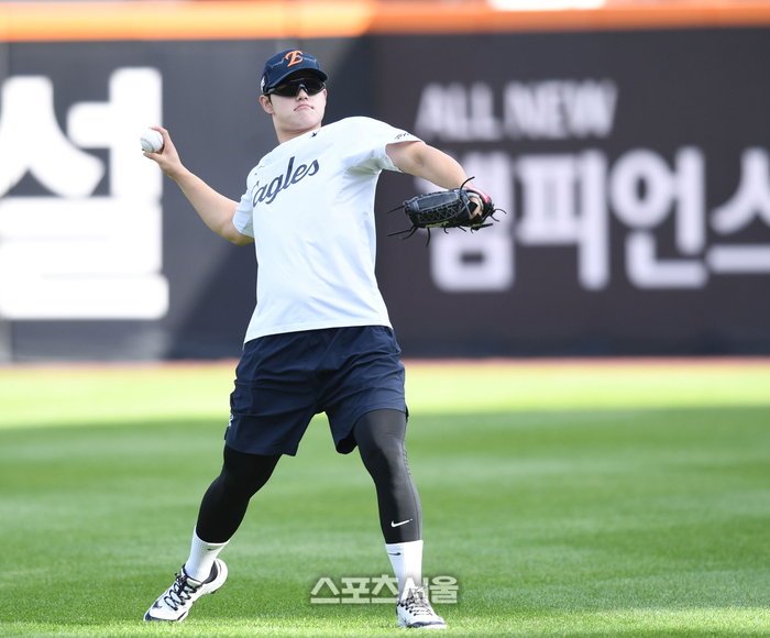 한화 투주 문동주가 24일 대전 한화생명볼파크에서 열리는 2025 KBO 포스트시즌 플레이오프 5차전 삼성과 경기에 앞서 몸을 풀고 있다.