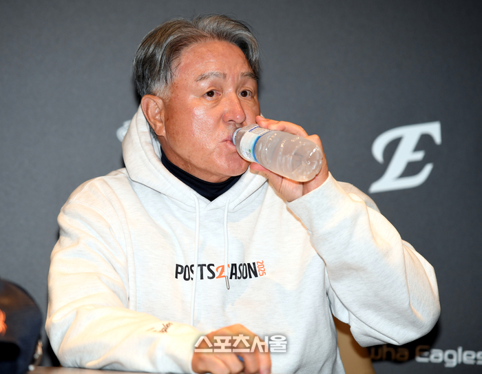 한화 김경문 감독이 24일 대전 한화생명볼파크에서 열리는 2025 KBO 포스트시즌 플레이오프 5차전 삼성과 경기에 앞서 기자회견 중 물을 마시고 있다.