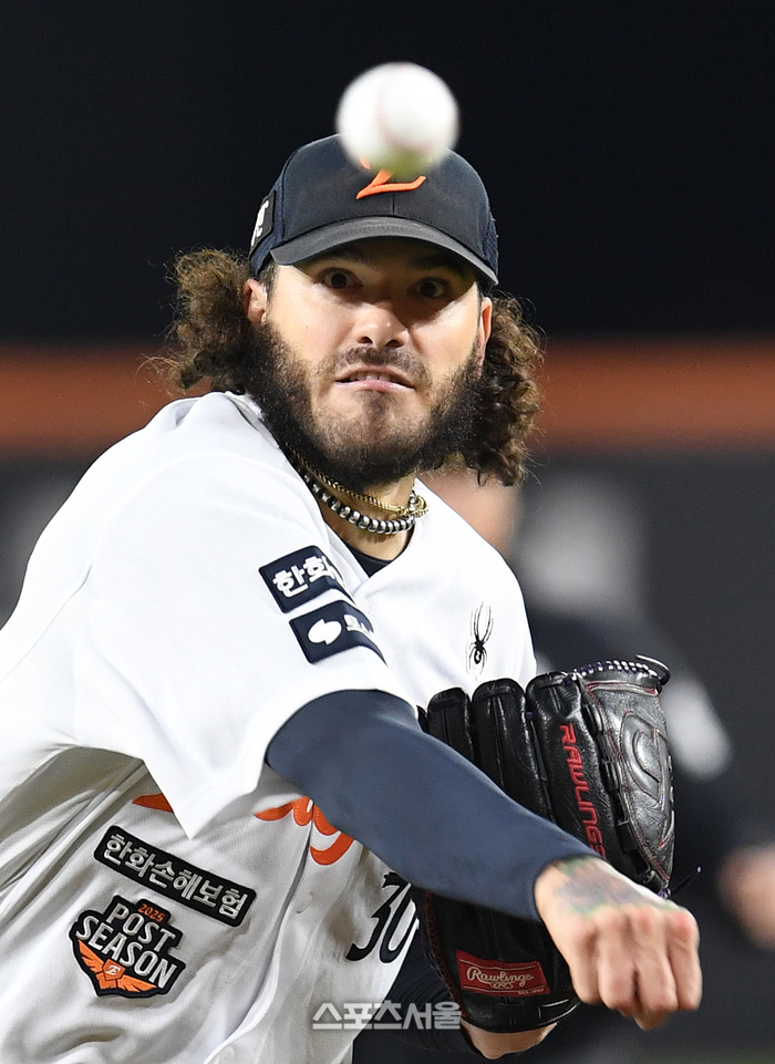 한화 폰세가 대전 한화생명볼파크에서 열린 2025 KBO리그 삼성과의 플레이오프 5차전에 선발 등판해 힘차게 공을 던지고 있다. 2025 10. 24.