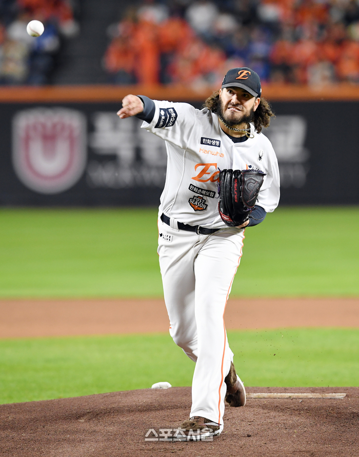 한화 폰세가 대전 한화생명볼파크에서 열린 2025 KBO리그 삼성과의 플레이오프 5차전에 선발 등판해 힘차게 공을 던지고 있다. 2025 10. 24.