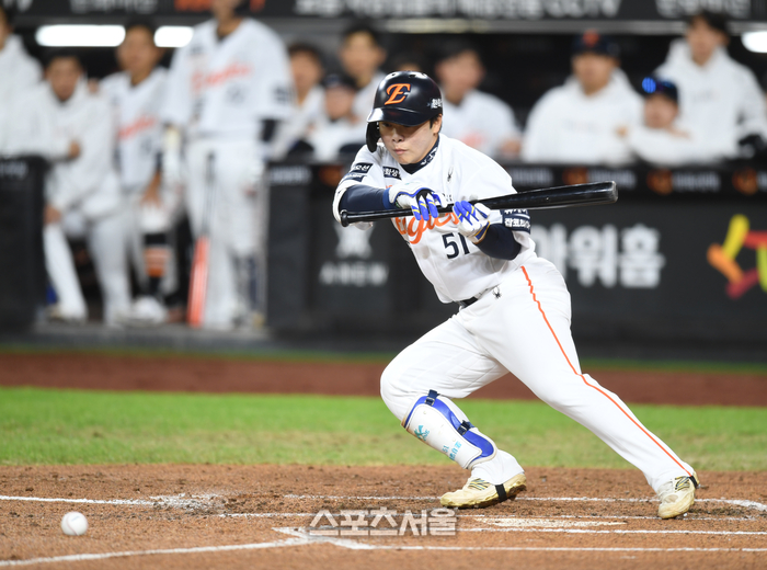 한화 문현빈이 24일 대전 한화생명볼파크에서 열린 2025 KBO 포스트시즌 플레이오프 5차전 삼성과 경기 1회말 무사1,2루 보내기번트를 시도하고 있다.