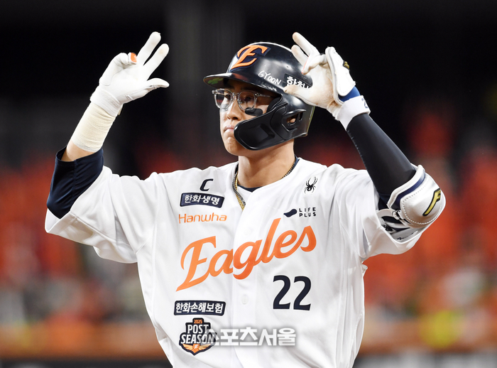 한화 채은성이 대전 한화생명볼파크에서 열린 2025 KBO리그 삼성과의 플레이오프 5차전 5회말 무사 2-3루 삼성 투수 양창섭을 상대로 2타점 적시타를 친 뒤 세리머니를하고 있다. 2025 10. 24.