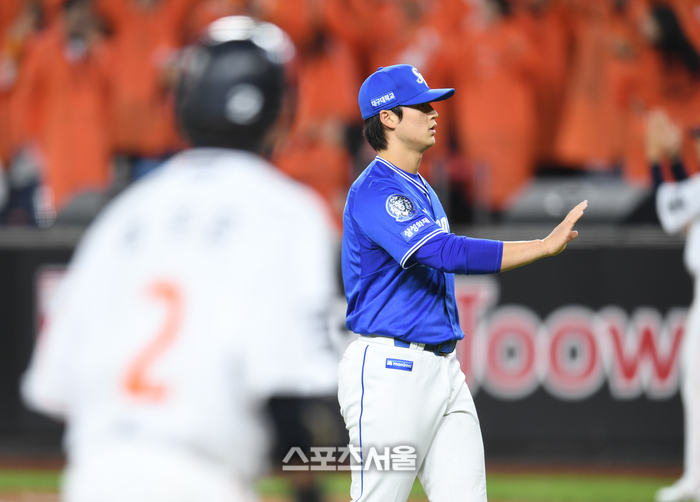 삼성 투수 이호성이 24일 대전 한화생명볼파크에서 열린 2025 KBO 포스트시즌 플레이오프 5차전 한화와 경기 6회말 무사만루 상대 문현빈에 볼넷을 허용한 후 아쉬워하고 있다.