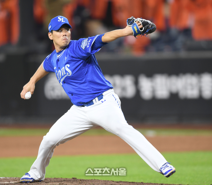 삼성 투수 김재윤이 24일 대전 한화생명볼파크에서 열린 2025 KBO 포스트시즌 플레이오프 5차전 한화와 경기 8회 역투하고 있다.