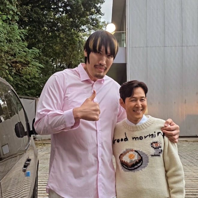 공개된 사진 속엔 이정재와 다정하게 어깨동무를 하고 있는 최홍만의 모습이 담겨있다. 특히 217㎝ 최홍만은 180㎝ 이정재를 아담한 비주얼로 만들어 웃음을 안겼다.