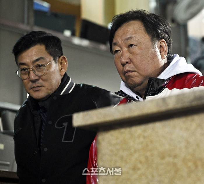 LG는 1차전에 이어 2차전도 승리하며 우승의 유리한 고지를 밟았다. 서용빈 LG 트윈스 전력강화코디네이터와 차명석 단장이 승리 후 귀빈석에서 내려오고 있다. rainbow@sportsseoul.com