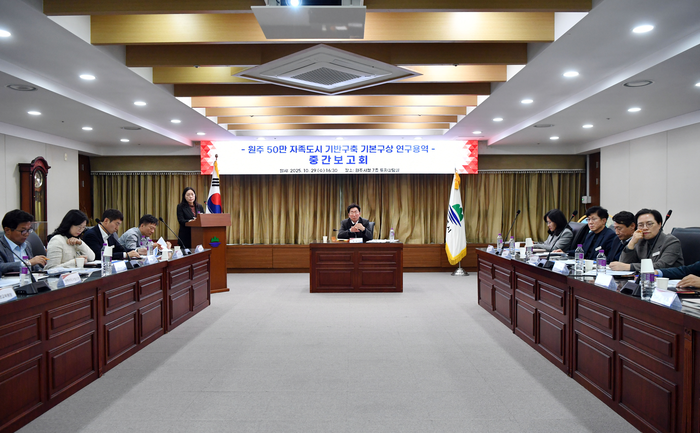 [스포츠서울ㅣ원주=김기원기자]원주시는 29일 시청 7층 투자상담실에서 ‘원주 50만 자족도시 기반구축 기본구상 연구용역’ 중간보고회를 개최했다.