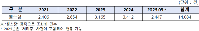 29일 더불어민주당 유동수 의원(당 정책위 경제수석부의장)은 “한국소비자원으로부터 제출받은 국정감사 자료에 따르면, 헬스장 피해구제 접수 건수는 지난 2021년 2406건에서 2024년 3412건으로 급증했다”라며, “올해도 9월 기준 2447건에 달하며 증가세가 이어지고 있다”라고 밝혔다.