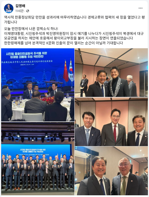 김 의원은 “오늘 만찬장에서 나온 깜짝 소식 하나”라며 “이재명 대통령, 시진핑 주석과 박진영 대중문화교류위원장이 잠시 얘기를 나눴다”고 현장 분위기를 전했다.