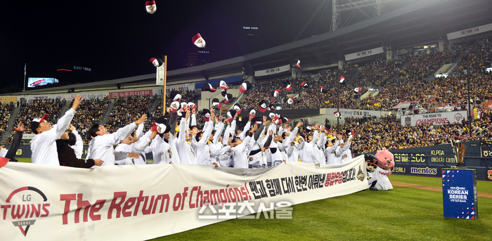 모두가 행복했던 청백전 후 이날 ‘하이라이트’ 샴페인 샤워가 펼쳐졌다. 선수들은 대전에서 뿌리지 못한 샴페인을 서로에게 뿌리며 우승 기쁨을 누렸다. 끝이 아니다. 관중들에게도 샴페인을 뿌리며 ‘트윈스라는 이름’으로 하나 돼 우승 축제를 즐겼다.