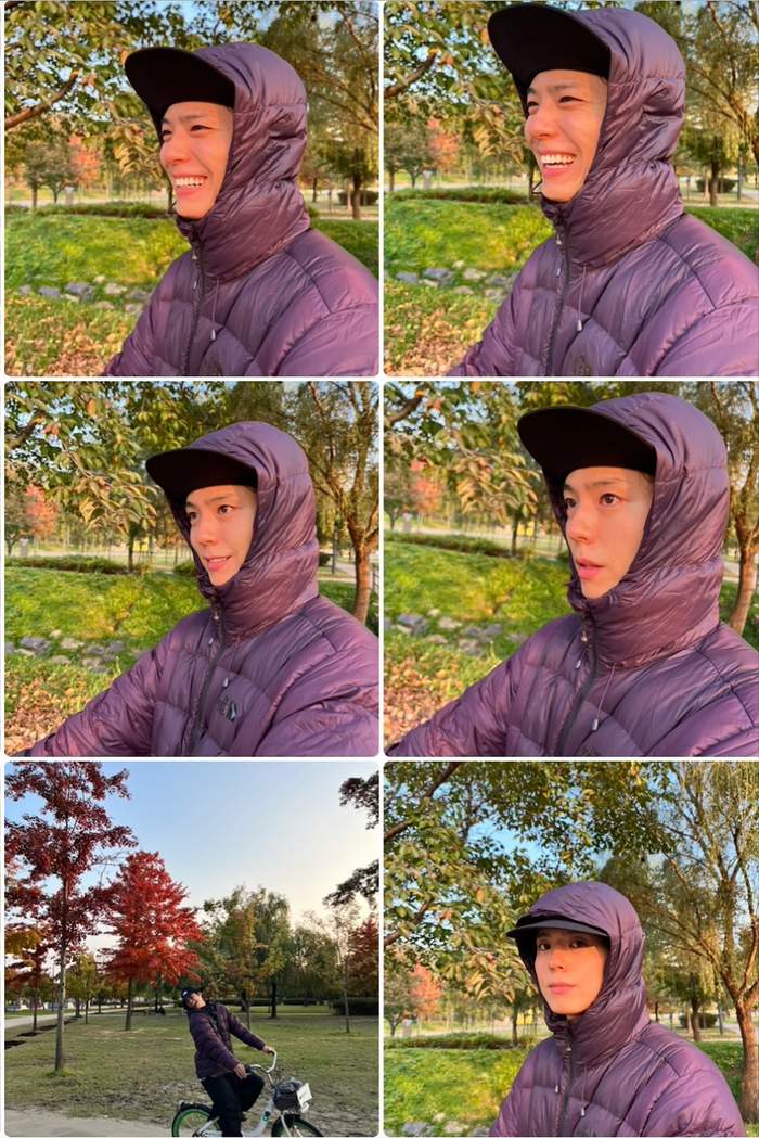 공개된 사진 속 박보검은 보라색 패딩 점퍼에 모자를 쓴 편안한 차림으로 자전거 라이딩을 즐기고 있는 모습이다.