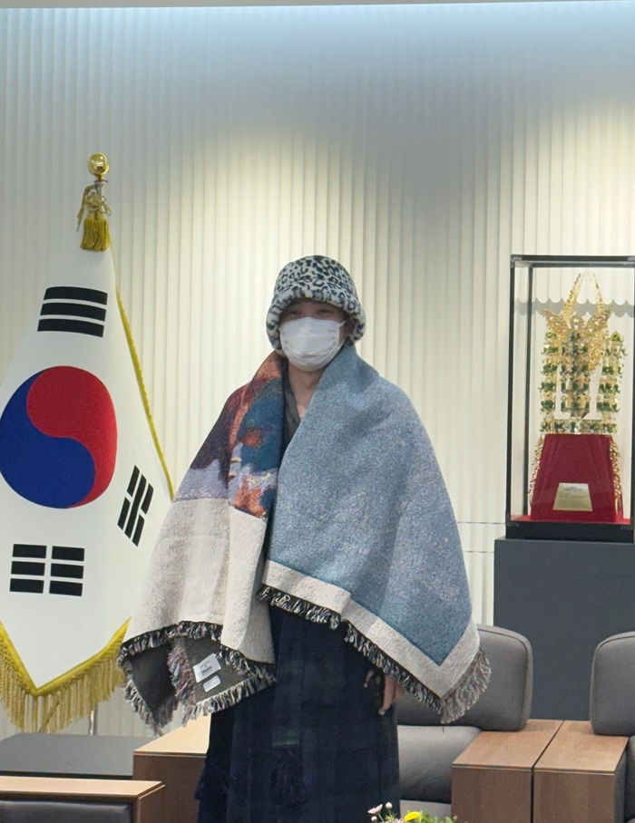 사진 속 지드래곤은 이재명 대통령이 도널드 트럼프 미국 대통령에 선물한 천마총 금관 모형 앞에서 담요를 둘러쓴 채 미소를 짓고 있다.