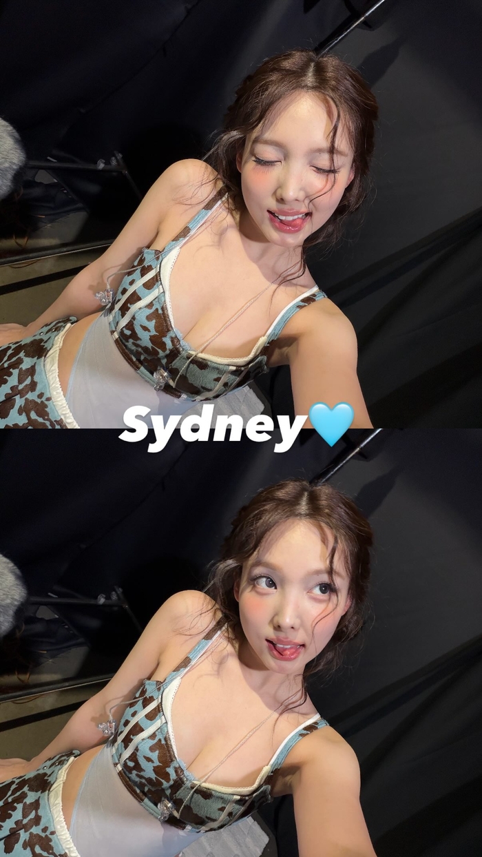 특히, 코르셋 스타일의 블루-브라운 패턴 민소매 톱과 미니멀한 하의가 돋보이는 의상은 슬림한 몸매를 더욱 부각시켰다. 윙크와 살짝 내민 혀, 그리고 귀여운 표정 등 장난기 넘치는 포즈는 팬들에게 특별한 선물을 안겼다. 여기에 “Sydney”와 “you were amazing!!!”이라는 문구를 더하며 현지 팬들에 대한 뜨거운 애정을 보여줬다.