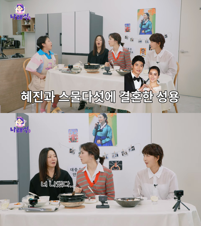 한혜진은 5일 유튜브 채널 ‘나래식’에 출연하여 김희선, 진서연과 함께 결혼과 연애에 대한 이야기를 나누던 중, 기성용이 25세의 젊은 나이에 결혼했음을 언급했다.