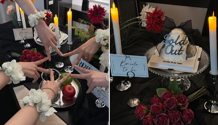테이블 위에는 붉은 장미와 화이트, 보라 계열의 플라워 데코레이션, 그리고 은은한 캔들이 놓여 있어 세련되면서도 로맨틱한 무드를 완성했다. ‘BRIDE TO BE’ 문구와 함께 웨딩드레스 모양의 케이크에는 ‘SOLD OUT’ 사인이 장식되어 있어 예비 신부의 유쾌한 설렘을 엿볼 수 있다.